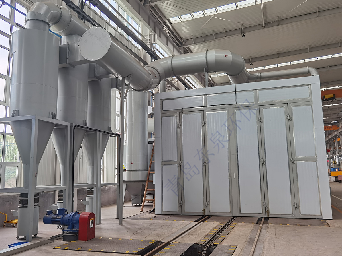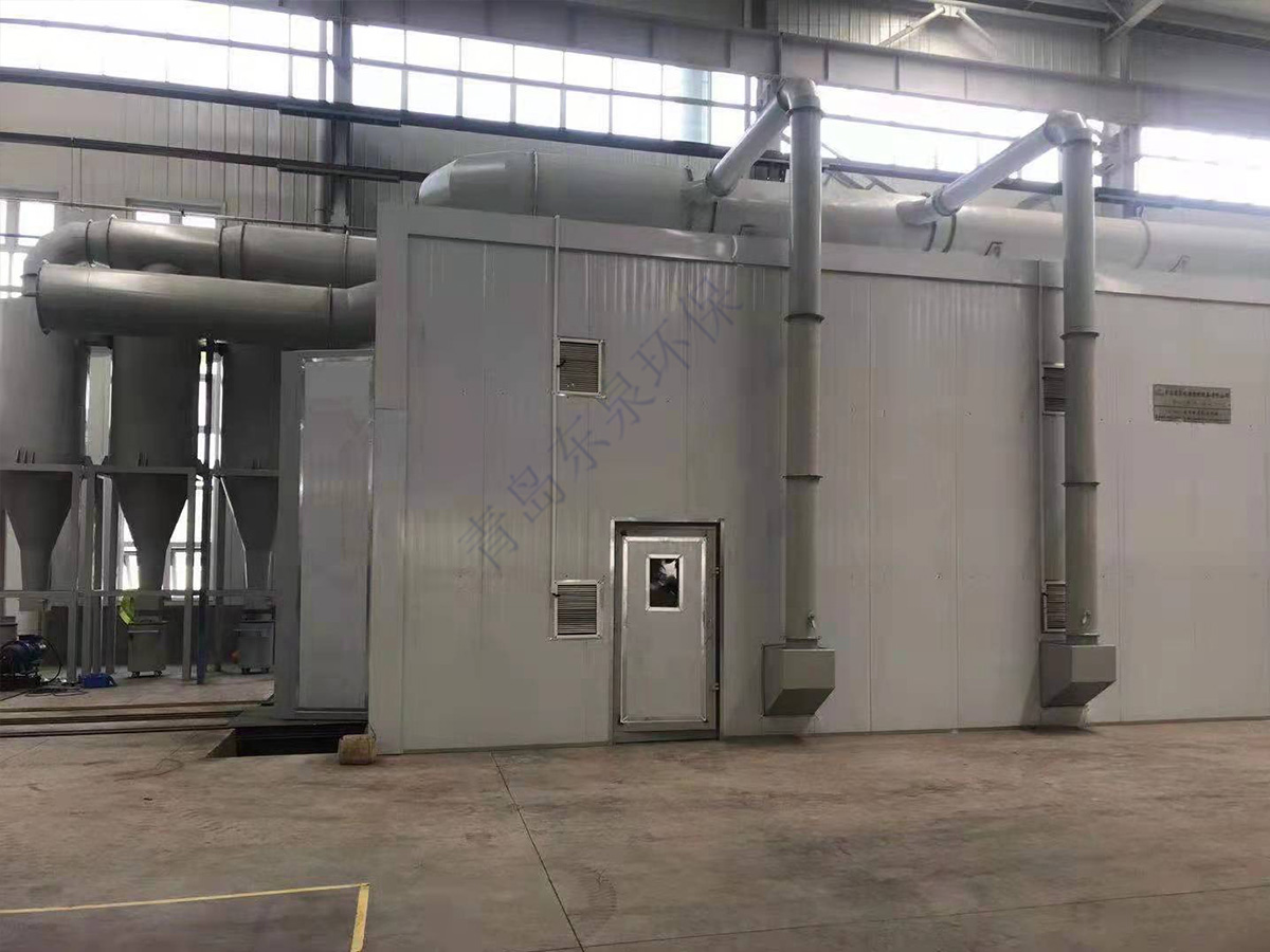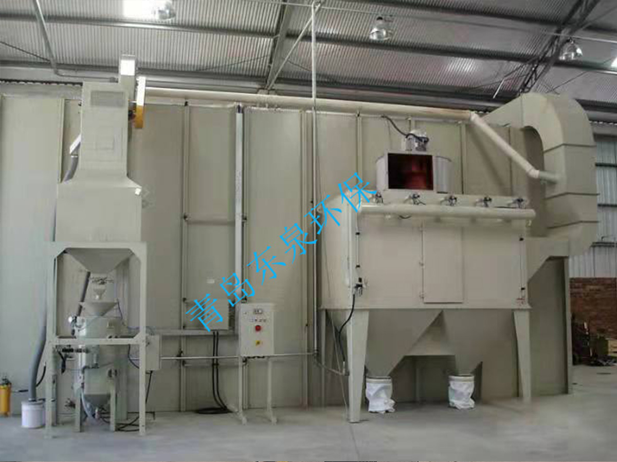砂料回收、分離及除塵系統(tǒng)的工作原理:噴砂時(shí)砂料掉落到蜂窩漏斗里,再由氣缸帶動(dòng)刮板往復(fù)運(yùn)動(dòng),使落入漏斗內(nèi)的砂料推送到噴砂房一端的螺旋輸送機(jī)里面,通過(guò)螺旋輸送機(jī)輸送到皮帶輸送機(jī)內(nèi),皮帶輸送機(jī)等把砂料送入風(fēng)選分離器中,風(fēng)選分離器將砂料分離至儲(chǔ)料斗,從而保持砂料的清潔度和純度,有用的砂料進(jìn)入儲(chǔ)砂罐內(nèi)繼續(xù)循環(huán)使用,粉塵及污物則隨氣流進(jìn)入除塵系統(tǒng)內(nèi),經(jīng)過(guò)除塵系統(tǒng)的過(guò)濾、干凈空氣排入大氣,粉塵及污物則儲(chǔ)存在粉塵筒中等待定期清理。
